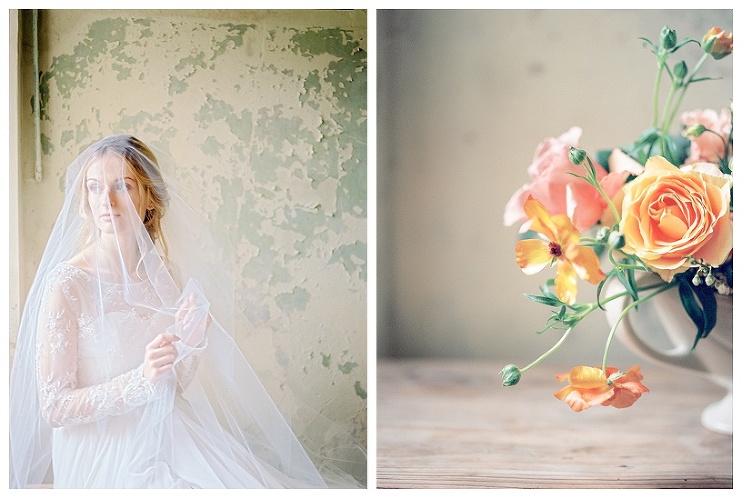 Mezi oprýskanými zdmi se krásná nevěsta a dokonale na aranžované květiny krásně vyjímají.