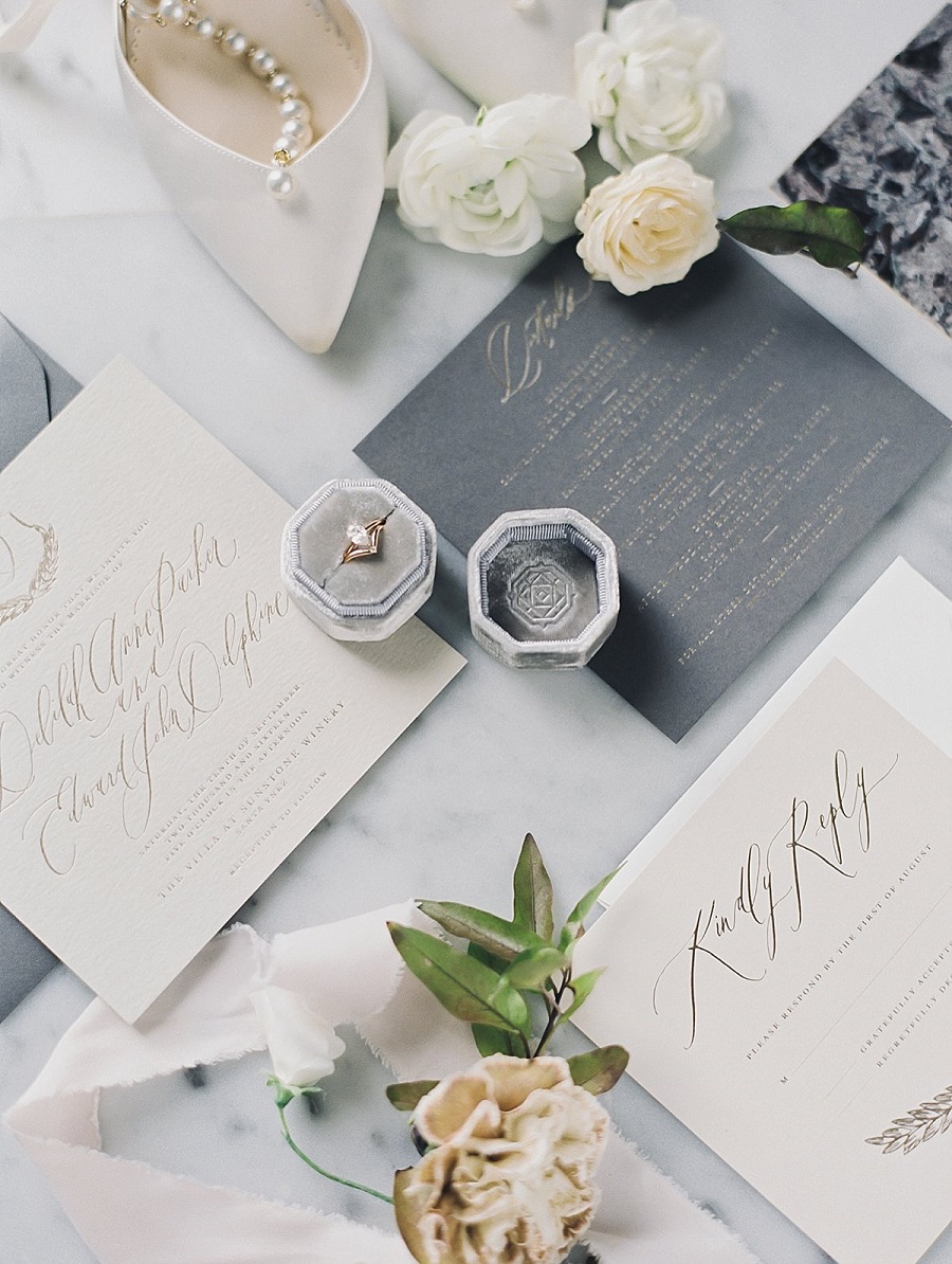 Foto: Donny Zavala Photography/Styling & plán: Scent of Orchid/Květiny:Nina E I Fiori/Kaligrafie: Written World Calligraphy/Makeup & účes: Sara’s Brides/Spodní prádlo: The Lace Atelier/Šaty:Monique Lhuillier/Boty:Bella Belle Shoes/Náušnice:Nea Milano/Prsten:Susie Saltzman/Místo konání:Villa Astor/Model:Klaida for 4Upper Models