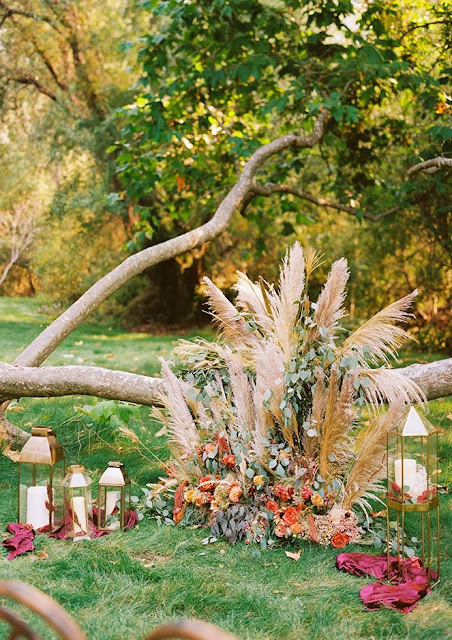 Malebná krajina poskytla dokonalé pozadí pro zvýraznění odvážných a texturních květin.Jeden z kultovních kalifornských dubů se stal ústředním bodem pro svatební obřad bohémského ranče.