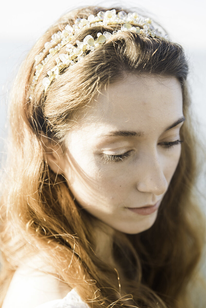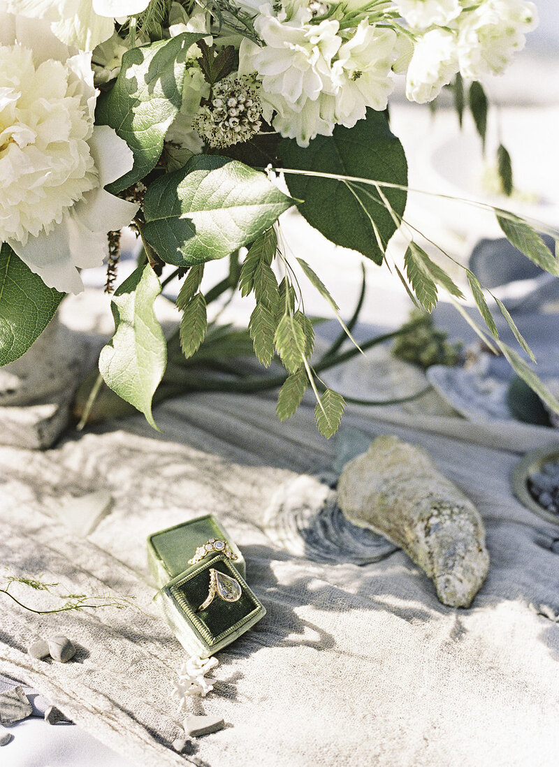 Inspirováno Malou mořskou vílou od Hanse Christiana Andersona. Květinové aranžmá s mořskou zelení, sukulenty a akcenty karmínové a fialové na malém starožitném stolku pro dva podél okraje vody, vytváří perfektní pozadí pro tento přímořský útěk. Korál, staré mořské sklo a starožitné šperky jsou zakomponovány jako z pokladnice a vzdávají hold původní pohádce.