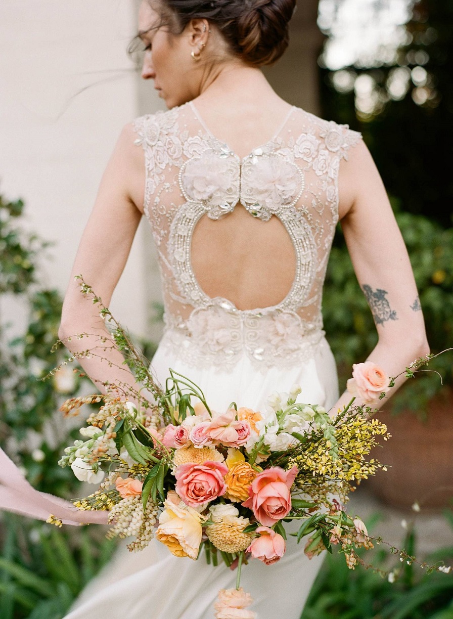 Každý detail a okamžik v tomto snímku zapouzdřuje eleganci výtvarného umění.Nevěsta oblékla krásné šaty od Claire Pettibone.