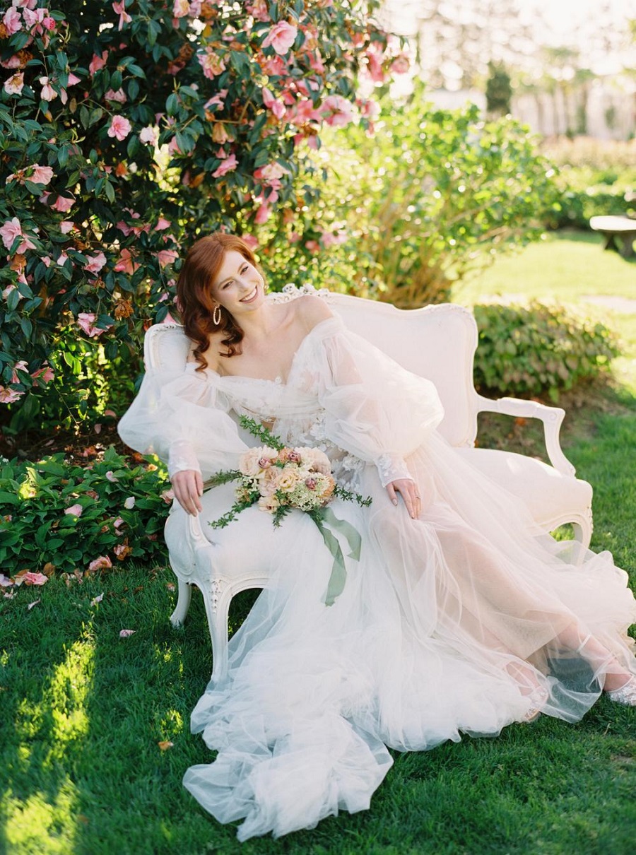 Blue Rose Photography se inspirovala romantickým květem kamélie a přeměnila Christianson's Nursery na okouzlující místo s tajnou zahradou. Nemovitost plná fialových květů je nádhernou kulisou pro venkovní oslavy a okouzlující pohádkovou róbou, jakou navrhla Liz Martinez Bridal .
