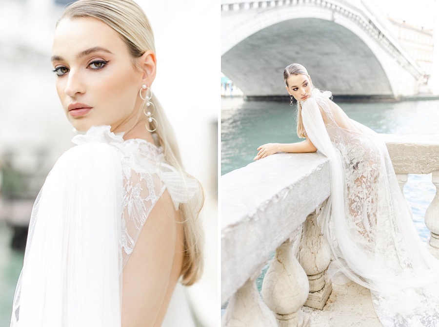 Tento krásný a půvabný úvodník z Benátek evokuje umělecké a silné ztvárnění nevěsty na pozadí starého světa. Díky úžasným šatům s otevřeným zadním dílem a spoustou krajkových detailů je inspirace přerušovaná krásnými květinami a detaily kamenné architektury doslovné umělecké dílo.