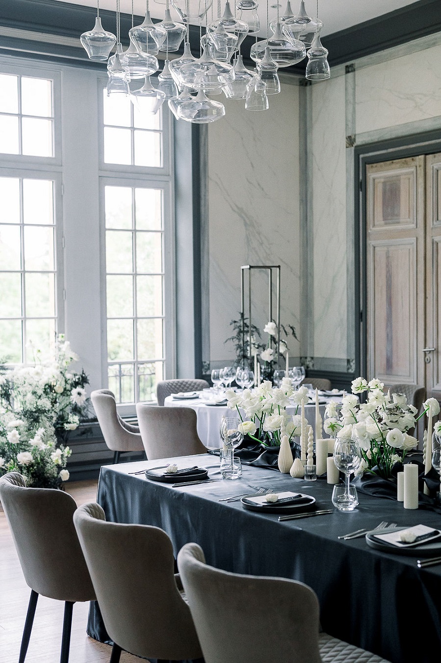 Cílem této inspirace je ukázat, jak může být černobílá svatba jemná a moderní zároveň. Princeznovské šaty s velkolepou saténovou vlečkou a velmi módními detaily. Elegantní dort plný detailů: krajky a perel, který nám připomíná svět svatebních šatů.