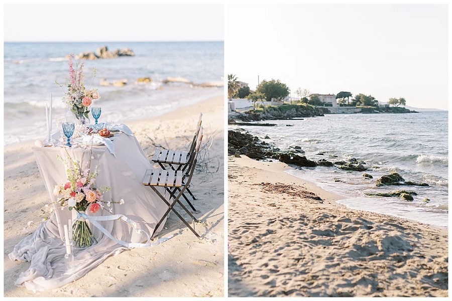 V této krásné letní inspiraci čeká nevěsta na svého ženicha se svoji malou dcerkou na krásné pláži, kde již čeká i prostřený stůl. Díky dekoracím z korálů a škeblí je tato inspirace v duchu mořské svatby.