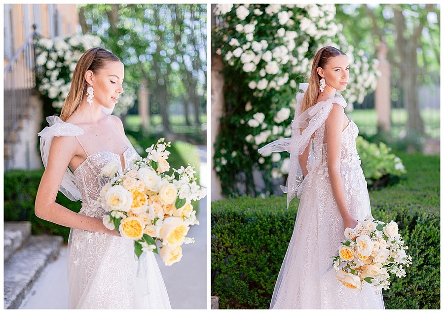 Tento kouzelný snímek nás zavede do pohádkového Château de Fonscolombe v Aix en Provence ve Francii. Nevěsta měla na sobě světlé, částečně třpytivé tylové svatební šaty od Berty s tenkými ramínky, 3D květinovými nášivkami a jemnými mašlemi na ramenou, které jí visely dolů jako závojíčky, takže připomínala anděla.
