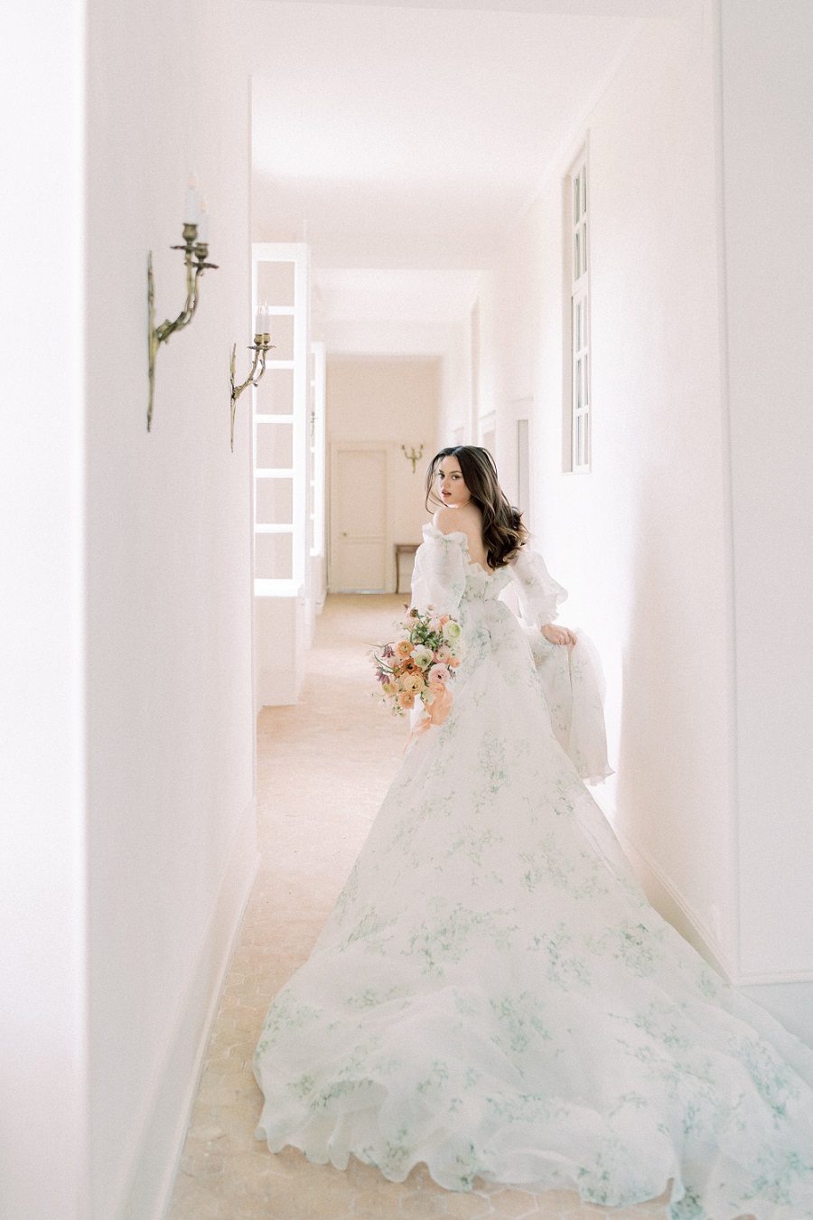 V této inspiraci má nevěsta krásné šaty od Monique Lhuillier a o nádherné květiny se postarali květináři z Winsome Floral.