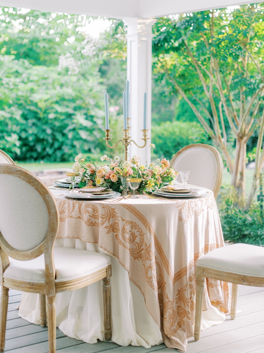 Krásná nevěsta v zahradní inspiraci u stolu s růžovými a oranžovými květinami.