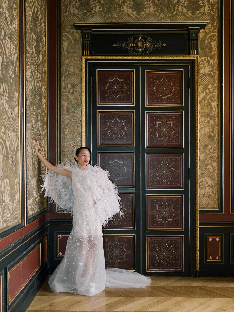 Intimní podzimní svatba v Paříži s romantikou starého světa a moderním nádechem. Obřad, recepce a krájení dortu se konaly v hotelu Hôtel d'Évreux na náměstí Place de Vendôme v Paříži. Nevěsta měla na sobě nepřeberné množství svatebních šatů od Elie Saab. Mezi mnoha detaily patřil tyl, peří a květinové aplikace.